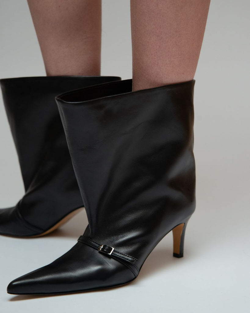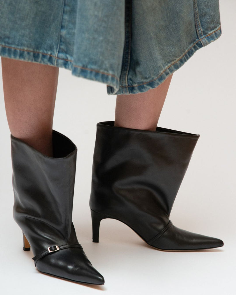 Onam boot features exaggerated wide shaft set on a pointy toe and 5.5 cm heel.