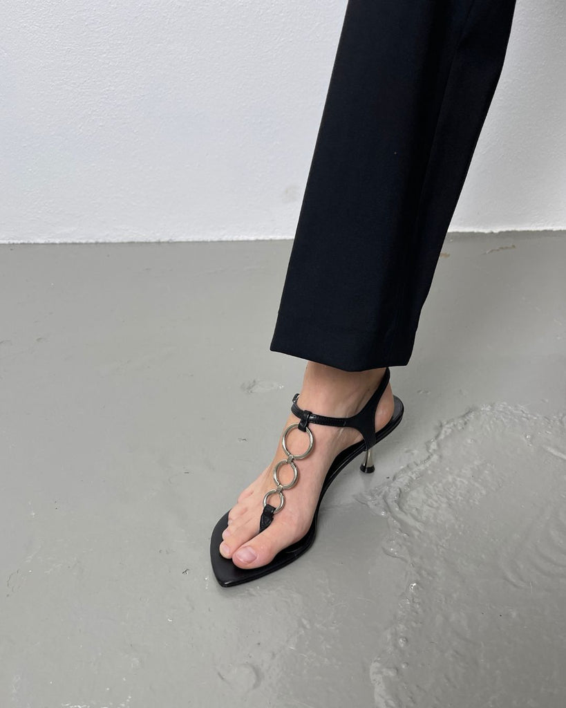 Thong sandal with metal circle band. Set on a polished metal heel and curved last.