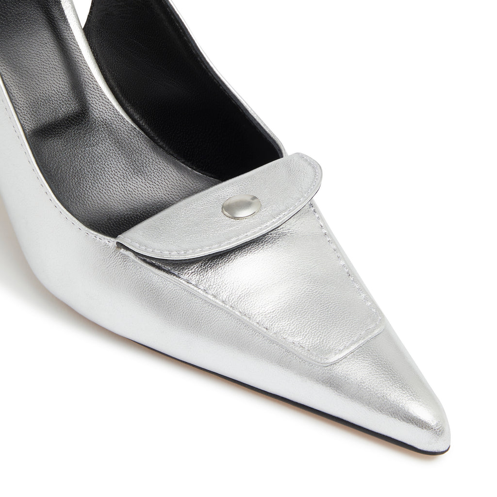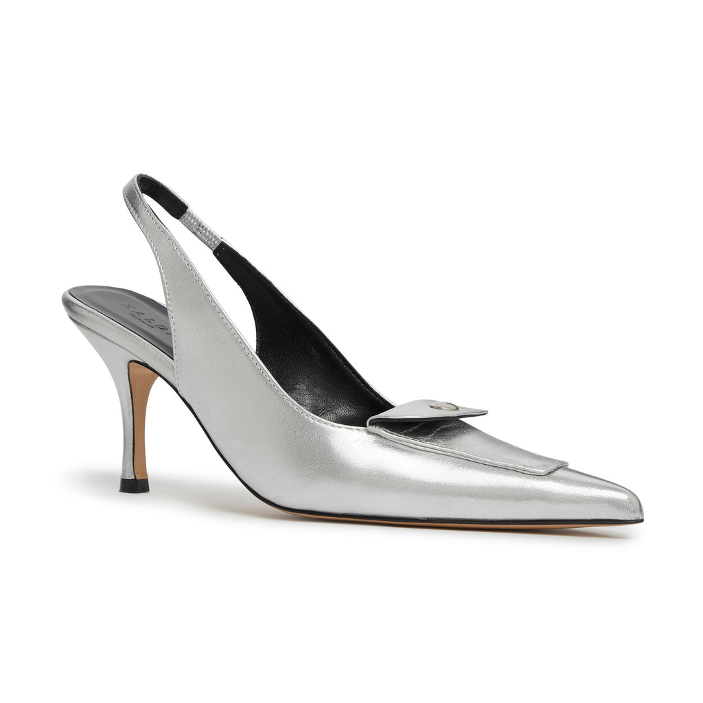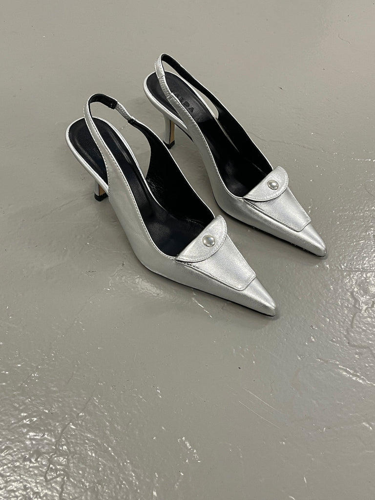 Vasa is a pointy toe sling back featuring a small pocket with metal snap closure.